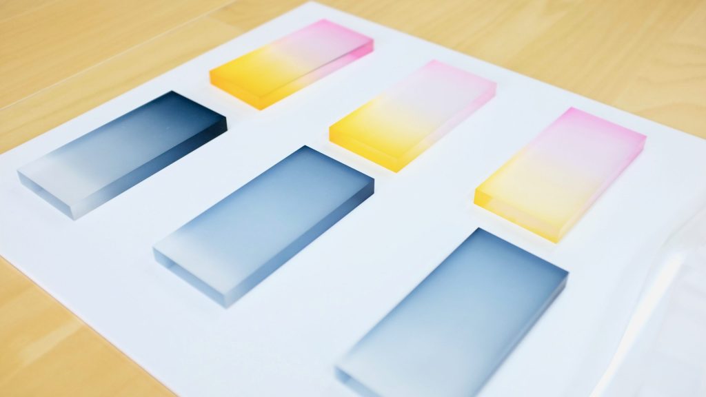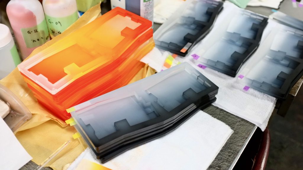 今回のご依頼は、アクリル樹脂のキーボード筐体をグラデーションに染色するというもの。こだわり持って作り上げられたキーボード筐体の透明性やサンドブラストした表面の美しさを消さないような染色が求められました。