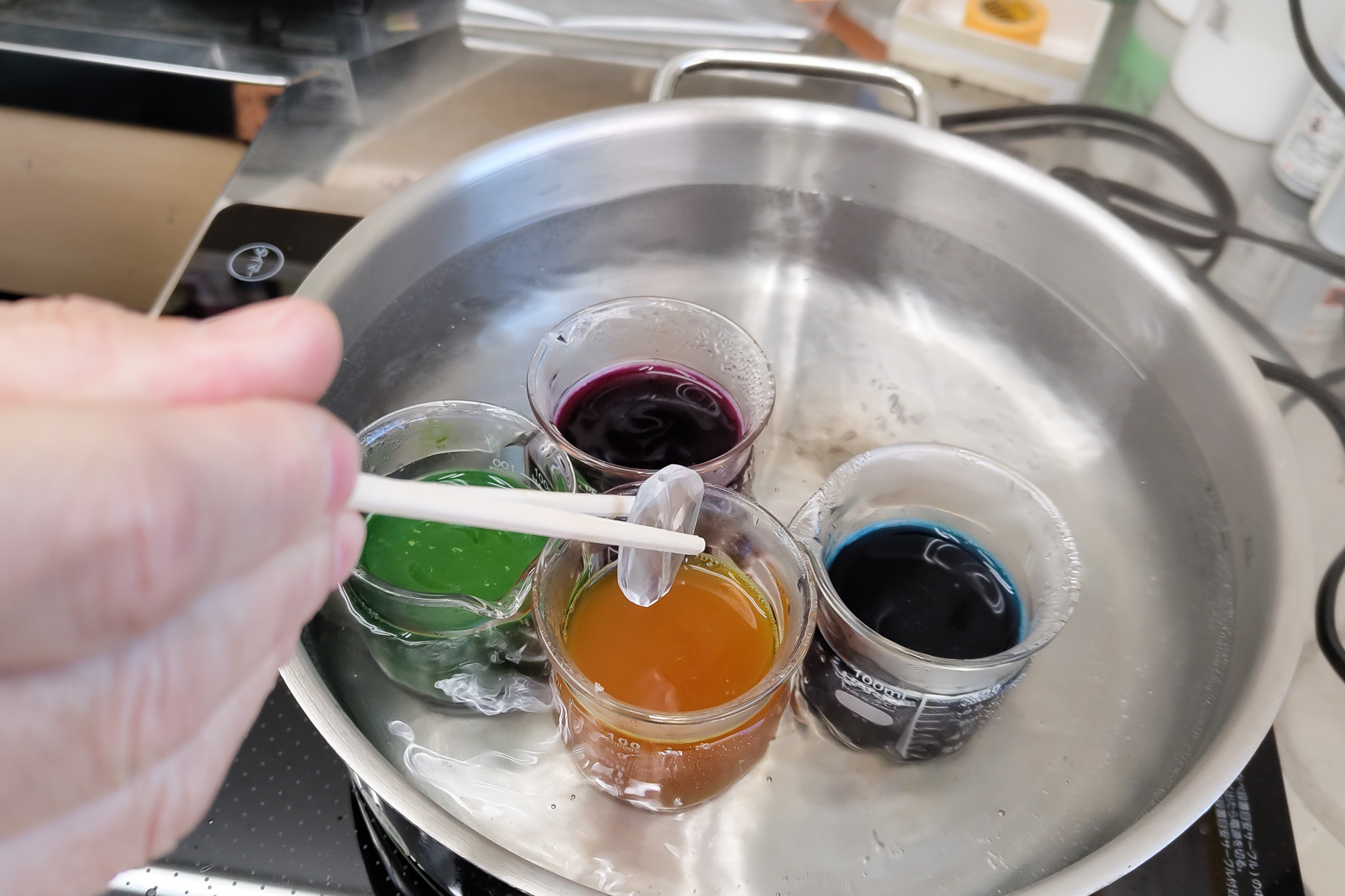 ビーズを染色液にゆっくり浸します。今回はグラデーションに染色するため、お箸で掴みながら片側ずつ染色。染めムラが出ない様に適温 (70℃~80℃)で3分程度煮て、お好みの色に染めます。
