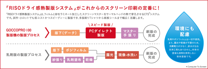 ゴッコプロ100は、デスクサイドにおける省スペース設計のデジタルスクリーン製版機。置き場所を選ばないため、省スペースでオーダーグッズビジネスをはじめられます。