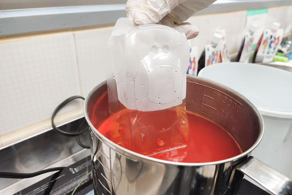 製品を30回以上よく振り混ぜ、染色液を容器に入れ、水かお湯で1対20の割合で希釈します。電子コンロなどで80℃まで染色液を加熱したら準備完了です。