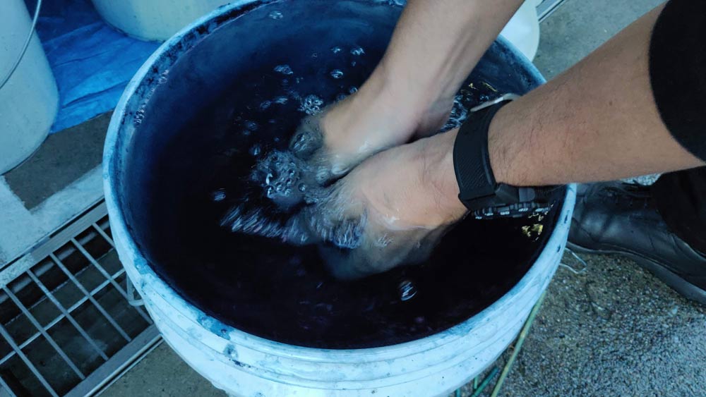 染め方も天然藍の藍染めと人工インディゴは基本的に同じです。それぞれ、湿らす、染料を溶かす、発酵させる、染色する、洗って乾かすの工程を経て染色を行います。