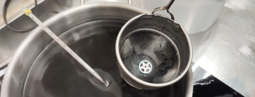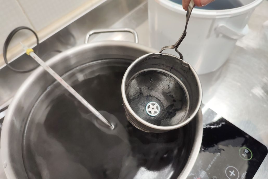 染めムラが出ない様にかき混ぜながら適温 (70℃~90℃)で3分から9分程度煮て、お好みの色に染めます。