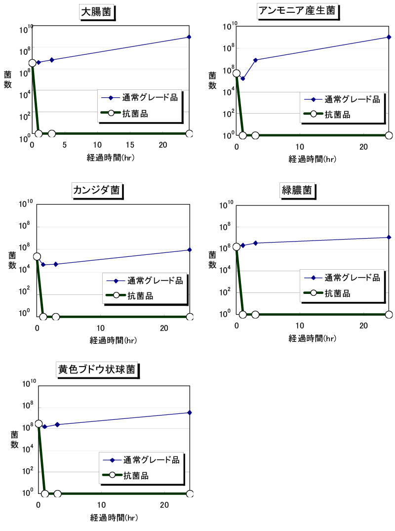 大腸菌、アンモニア産生菌、カンジダ菌、緑膿菌、おとび黄色ブドウ球菌のいずれの菌に対しても優れた初期抗菌効果(試験1時間後でほぼ生菌数は無くなる)、および抗菌性維持効果(試験24時間後でもほぼ生菌数はゼロ)を示します。従って、アンモニア、硫化水素等の発生を抑制し、消臭効果が期待できます。