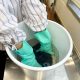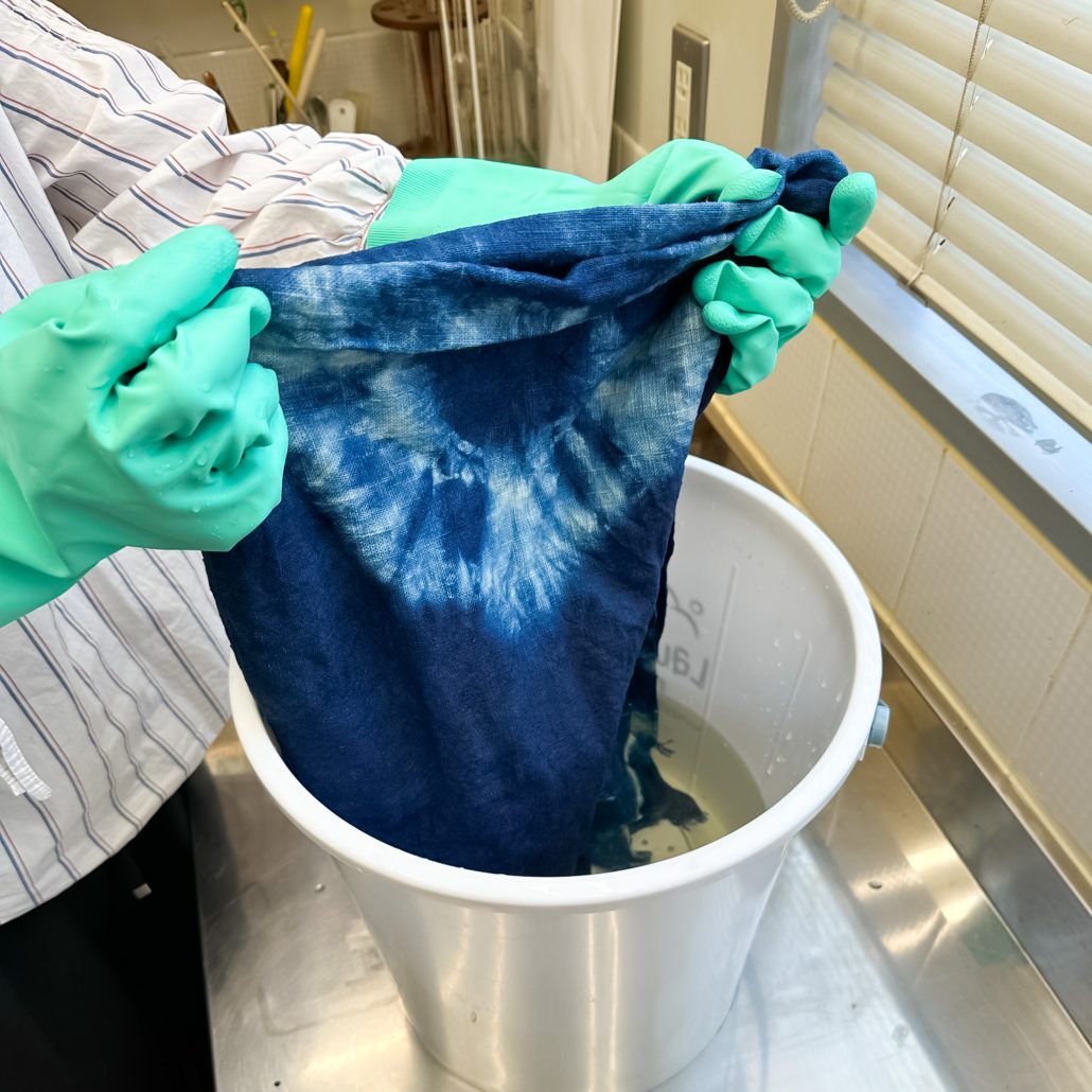 3,藍染めした生地を溶液の中で良く揉み15分間ほど漬けて繊維の内部までしっかり浸透させてください。