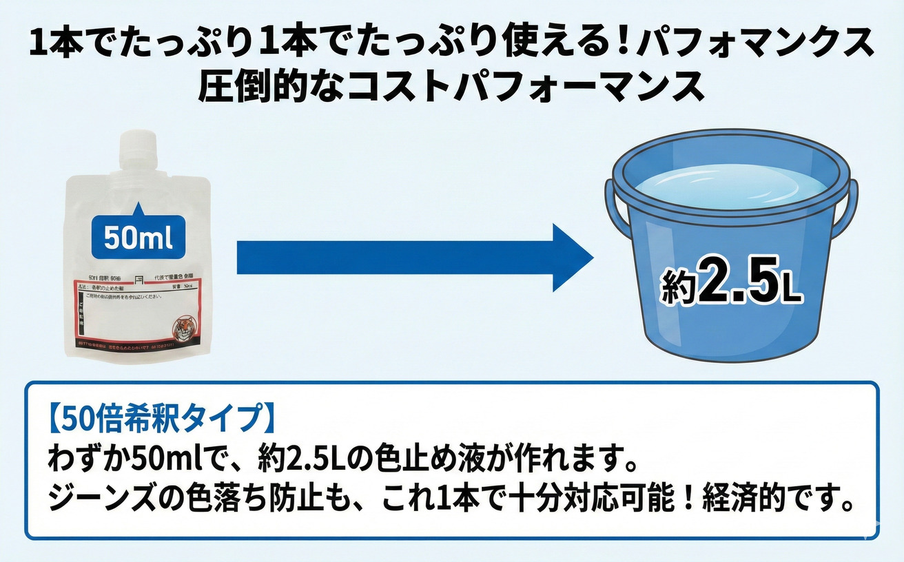 ✅ 経済的: 50ml製品は50倍希釈で約2.5Lの色止め液ができます。ジーンズの場合は1回の使用に50mlを2本推奨。