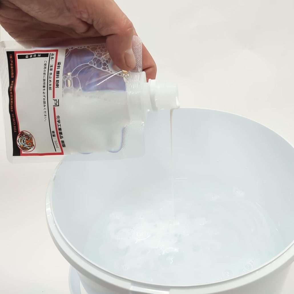 当製品は染色済み生地の色止め剤です。50倍濃縮の色止め液となります。特殊コーティングにより従来の方法より強い色止め効果があります。また生地の種類を選ばず素材の風合いを生かしたまま洗濯による色落ちを防ぎます。